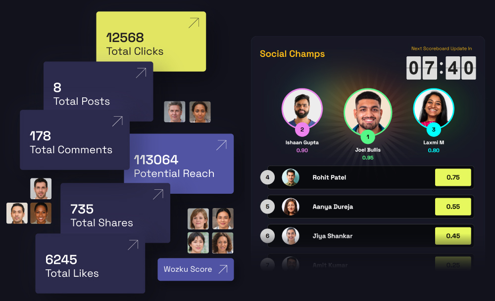 Wozku makes advocacy work by removing friction. It prompts people at the right moment and gives them the right content - so sharing feels natural to them and stays aligned to your brand. Every action is then tracked, so you see the real impact in clicks, registrations, and pipeline.